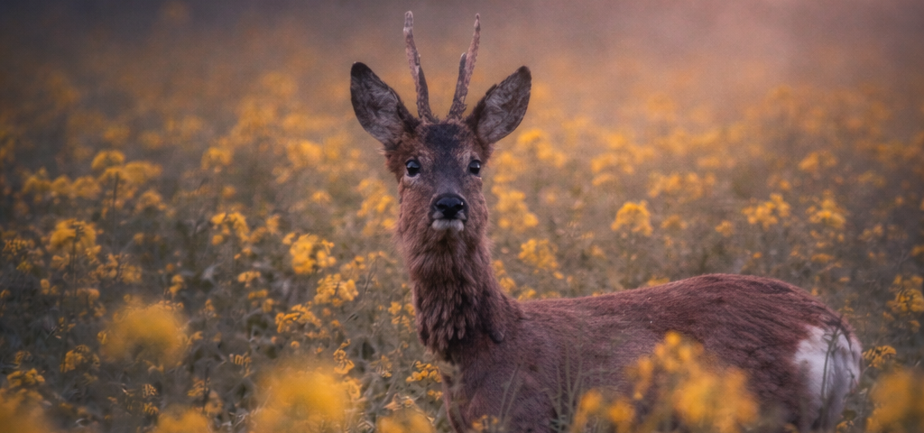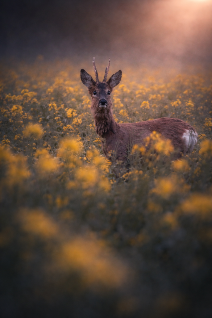 Rehbock steht in einem Feld voller gelber Blüten, umhüllt von warmem Abendlicht; der Vordergrund ist weich unscharf,