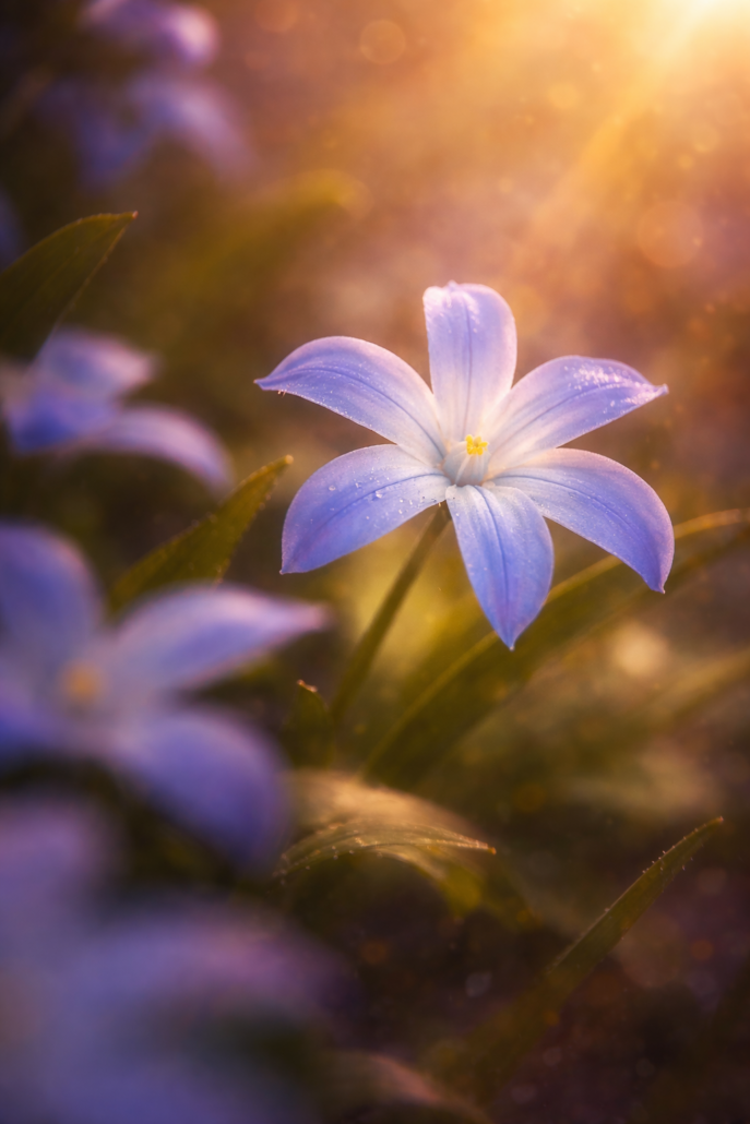 Die Welt atmet flach, noch halb verschlafen, als das Licht beginnt, die Ränder zu säumen. Ein einzelner Sternstern (oder Springstar) streckt sich aus dem kühlen Teppich des Bodens, als wäre er der letzte Zeuge einer Nacht, die sich heimlich in den Tag geschlichen hat. Die Blüte trägt Tropfen wie kleine Erinnerungen; sie glänzen nicht aufdringlich, sondern flüstern — leise, unverstellt.